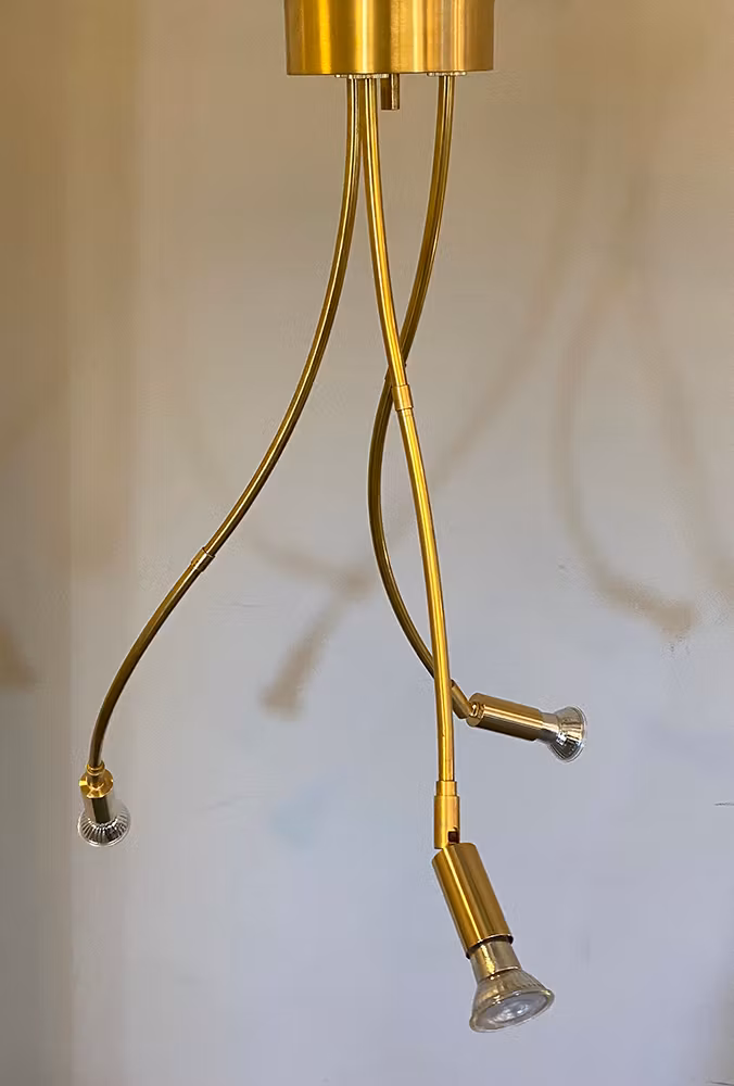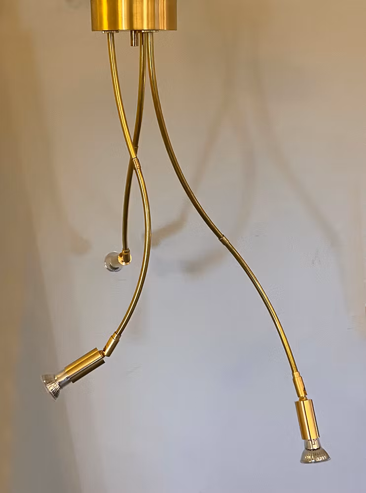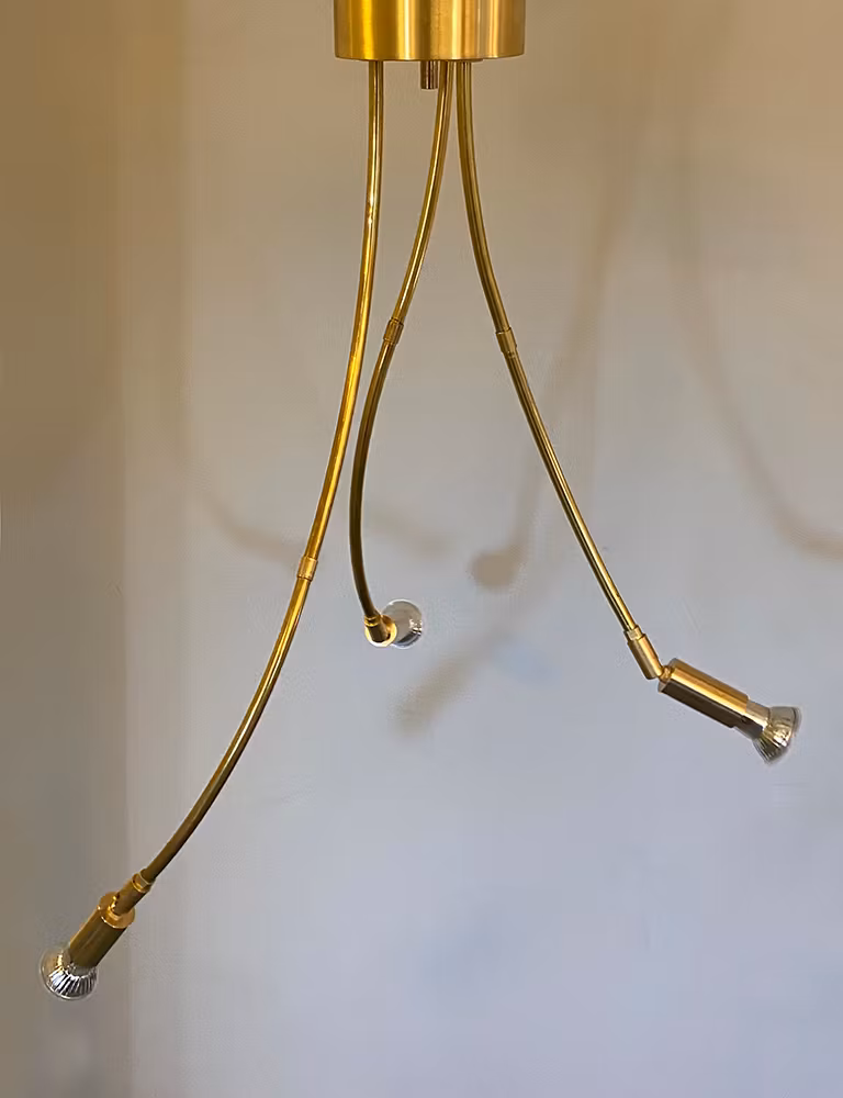 Taklampa i obehandlad äkta mässing med tre riktbara spotlight. Passar över ett bord, en köksö eller där det är högt i tak. När vi bygger våra runda spotskenor får vi böjda delar över som här har satts ihop i böljande former. Alla REUSE-lampor är unika. Lätt att montera i taket vare sig du har vanligt takuttag med krok eller vill placera den en bit ifrån uttage. Meddela då detta så kan vi dra ut en kabel i sidan som du sedan kan koppla in i ditt uttag. Du behöver bara skruva upp en krok där den ska sitta. DÅ mässingen är obehandlad mörknar den med tiden som äkta mässing gör. Vill du polera den är det bara att använda mässingsputs.