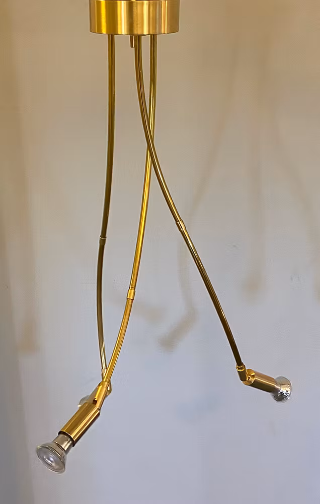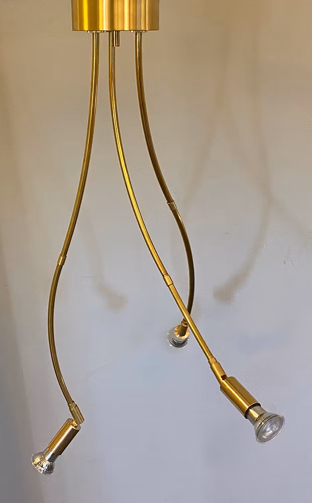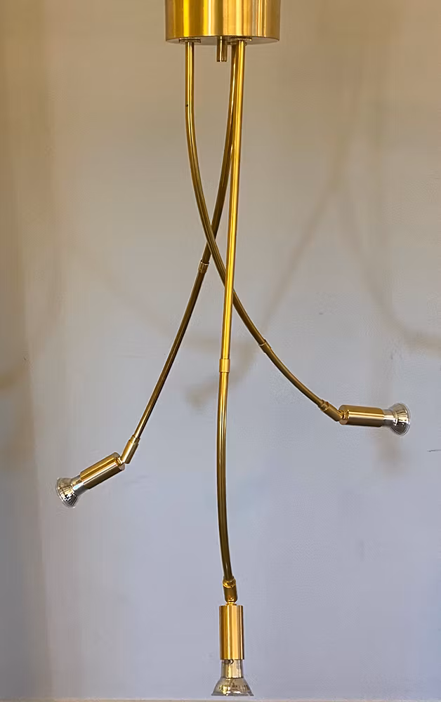 Taklampa i obehandlad äkta mässing med tre riktbara spotlight. Passar över ett bord, en köksö eller där det är högt i tak. När vi bygger våra runda spotskenor får vi böjda delar över som här har satts ihop i böljande former. Alla REUSE-lampor är unika. Lätt att montera i taket vare sig du har vanligt takuttag med krok eller vill placera den en bit ifrån uttage. Meddela då detta så kan vi dra ut en kabel i sidan som du sedan kan koppla in i ditt uttag. Du behöver bara skruva upp en krok där den ska sitta. DÅ mässingen är obehandlad mörknar den med tiden som äkta mässing gör. Vill du polera den är det bara att använda mässingsputs.