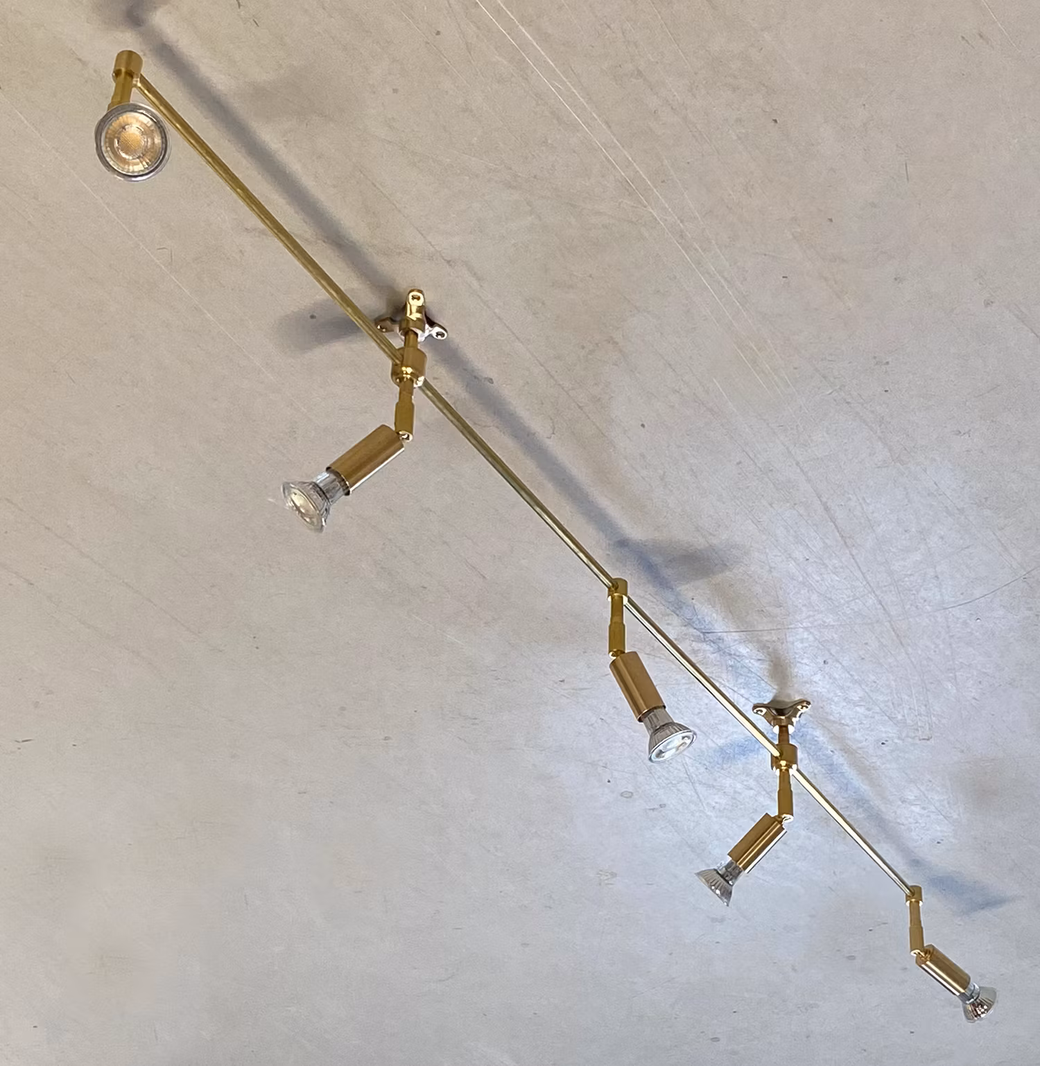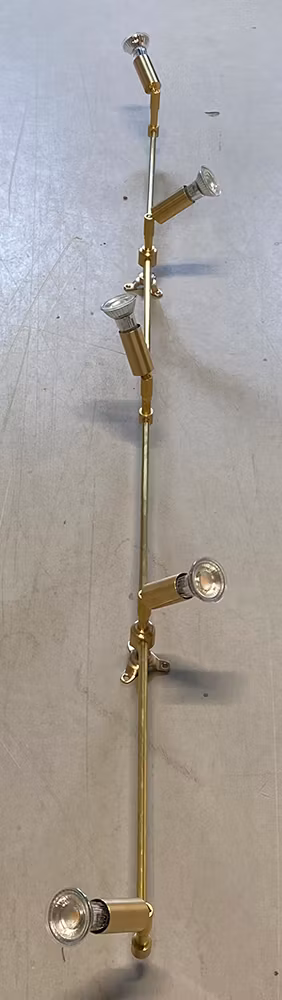 Spotskena i obehandlad mässing med fem riktbara spottar med E14-lamphållare. Mässingen åldras vackert med tiden.