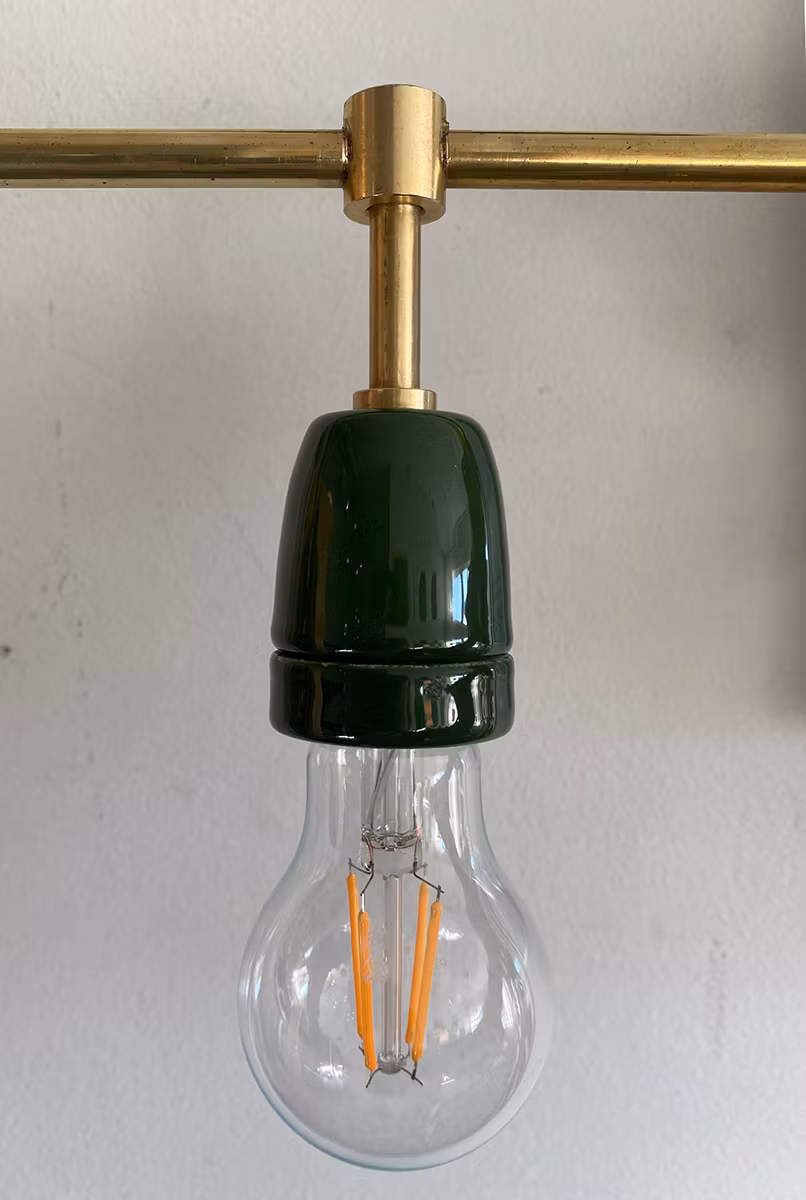 Skena i obehandlad mässing med lamphållare i porslin för lampor med E27-sockel. Du kan välja att sätta i spottar eller klot- eller globlampor. Fint när man vill sprida ljuset över en större yta.