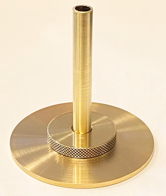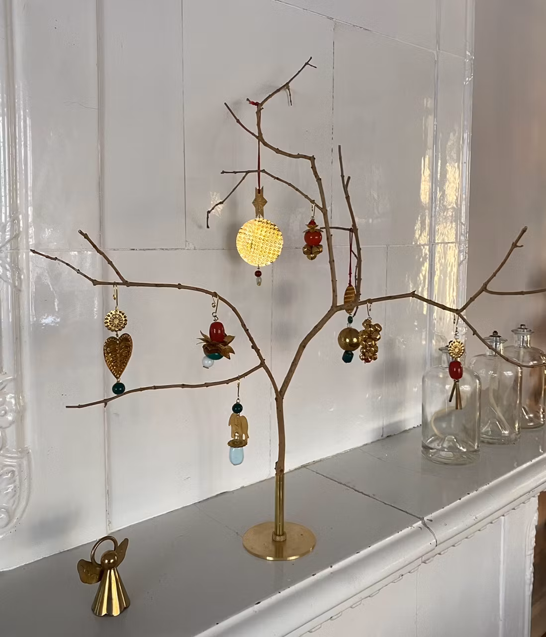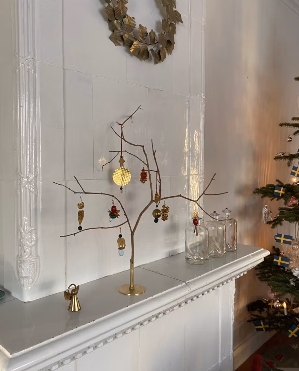 Vi behövde något att sätta en kvist i för att kunna hänga upp våra små hängen från Svenskt Tenn. Vi gjorde en liten fot i obehandlad mässing och gick ut och klippte av en syrenkvist och satte i.