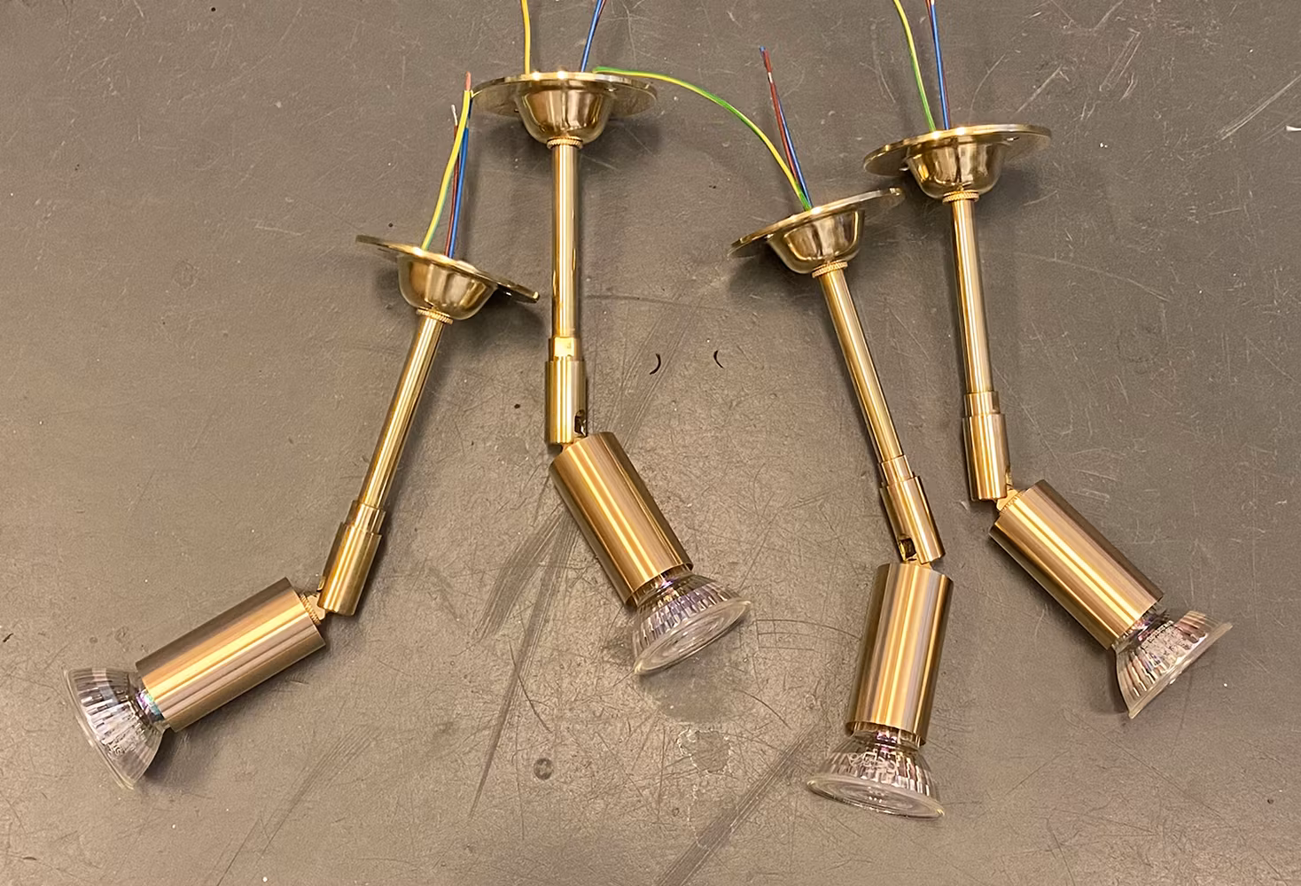 Nedpendlad enkelspot i obehandlad mässing som oxiderar och mattas av och mörknar med tiden för direktinkoppling. Passar bra när du har ett rör med kablar som kommer genom tak eller vägg. Det får plats en liten kopplingsplint/"sockerbit" eller små wagos bakom väggfästet.