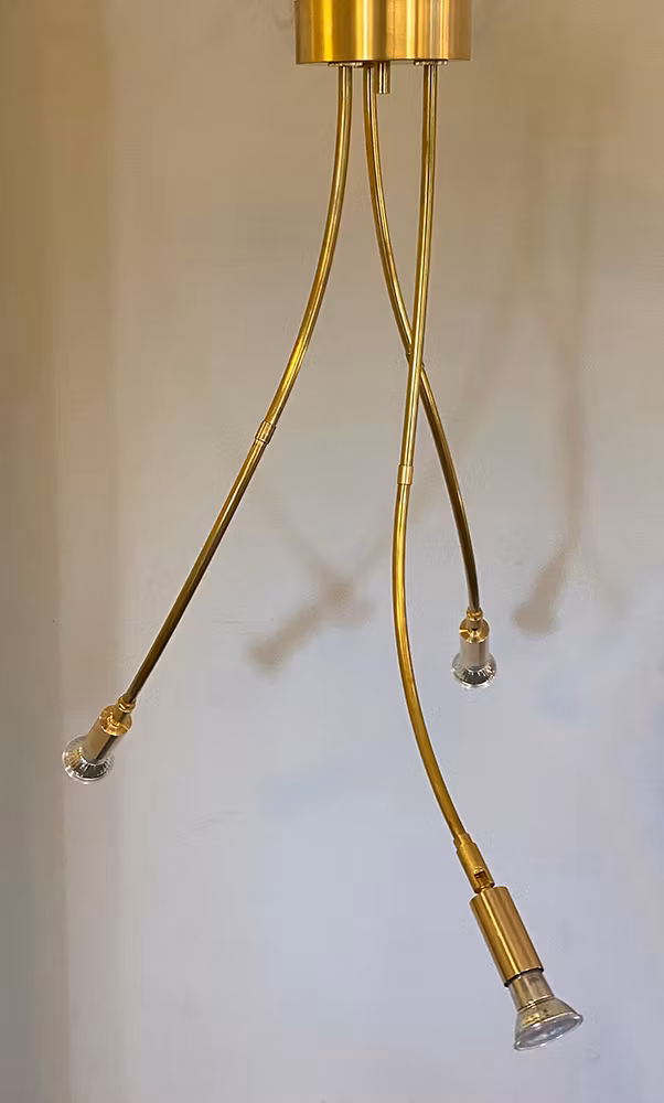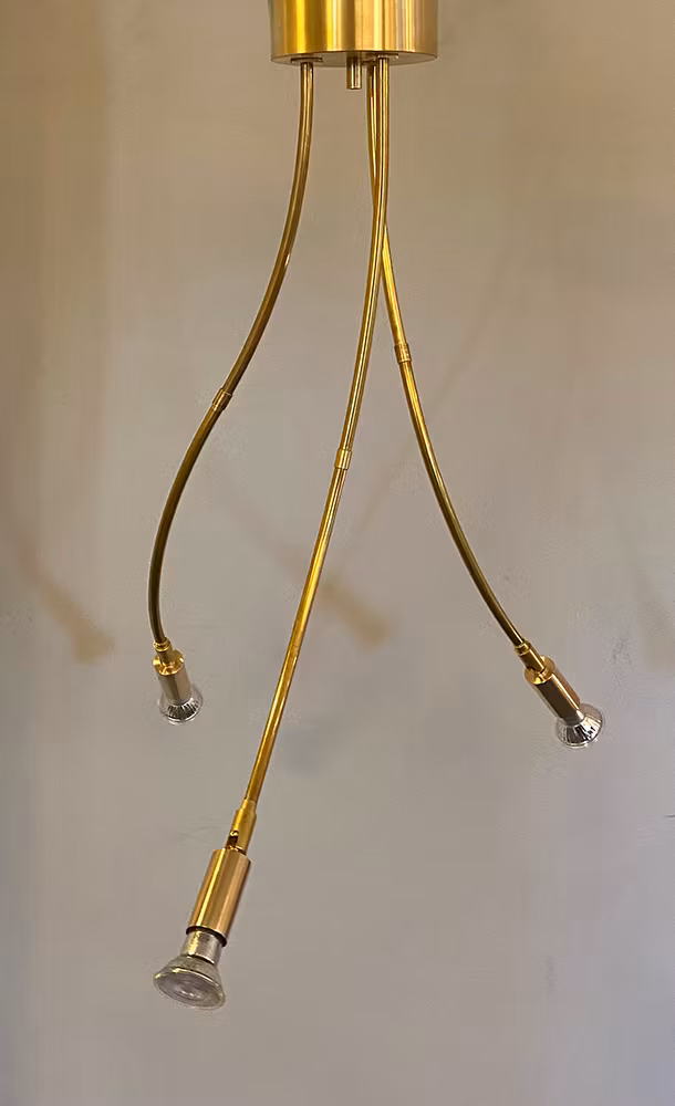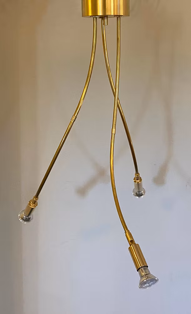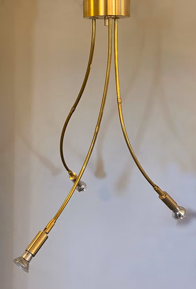 Taklampa tillverkad av böjda rör som blir över när vi gör lampan CIRCLE. REUSE är en serie taklampor som ingen är den andra helt lik. Dessutom ändrar lampan utseende beroende på från vilket håll du ser den. Lamporna är jordade och levereras med dimbara varmvita LED-spotlampor som är riktbara 90 resp 360 grader. Tillverkad för hand i obehandlad mässing. Varje lampa är unik och finns således bara i ett enda exemplar.