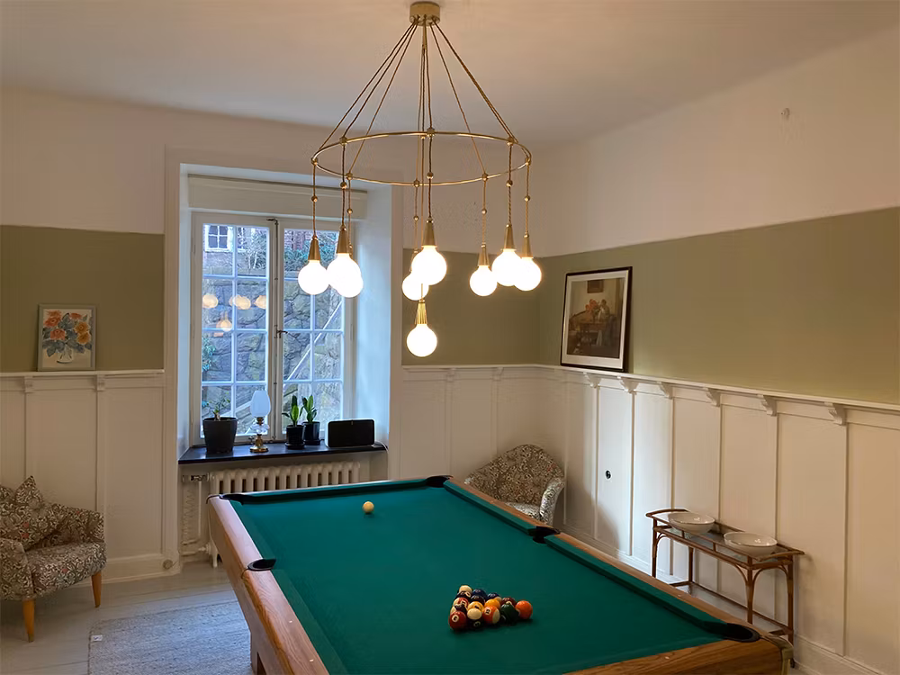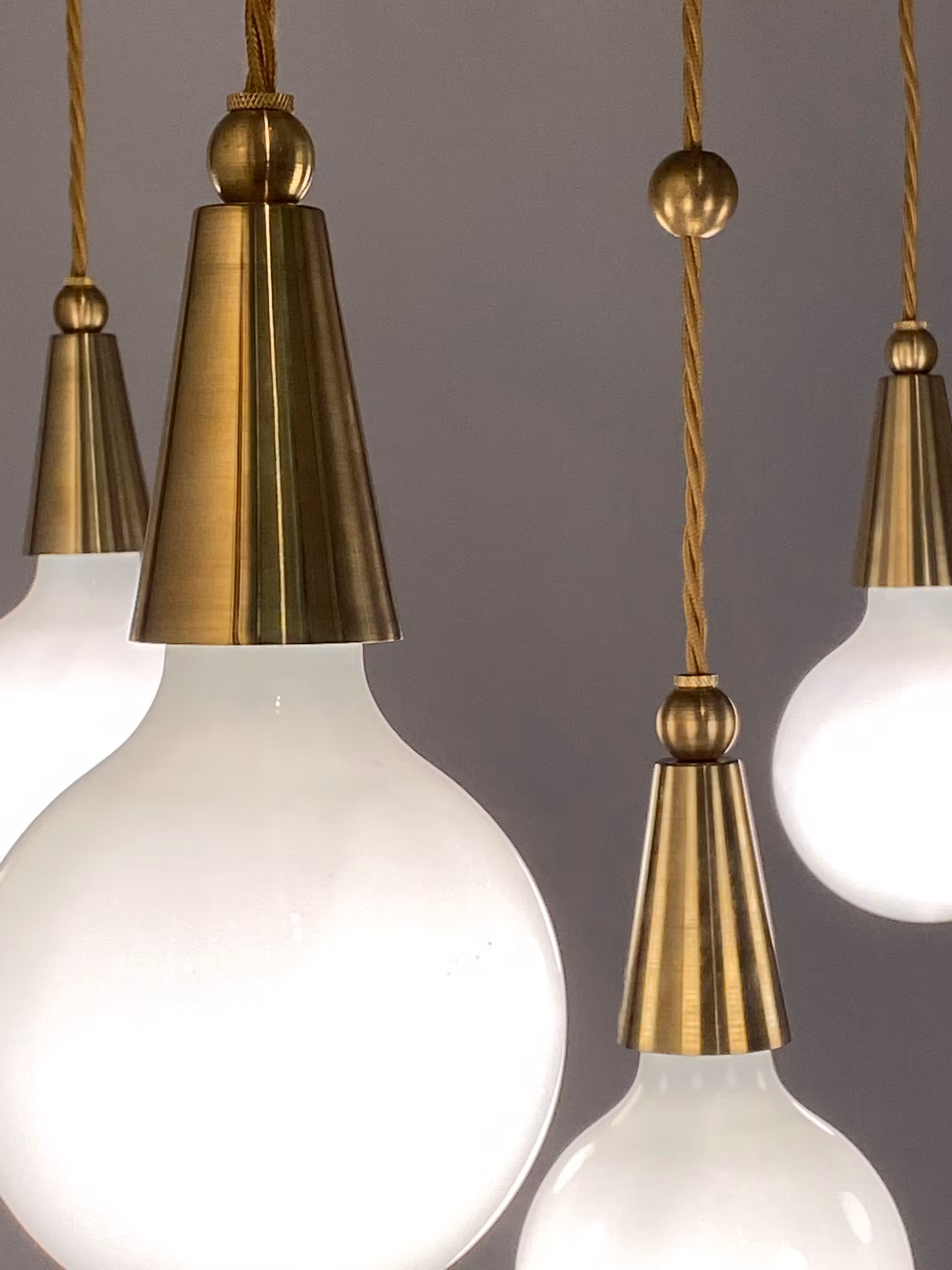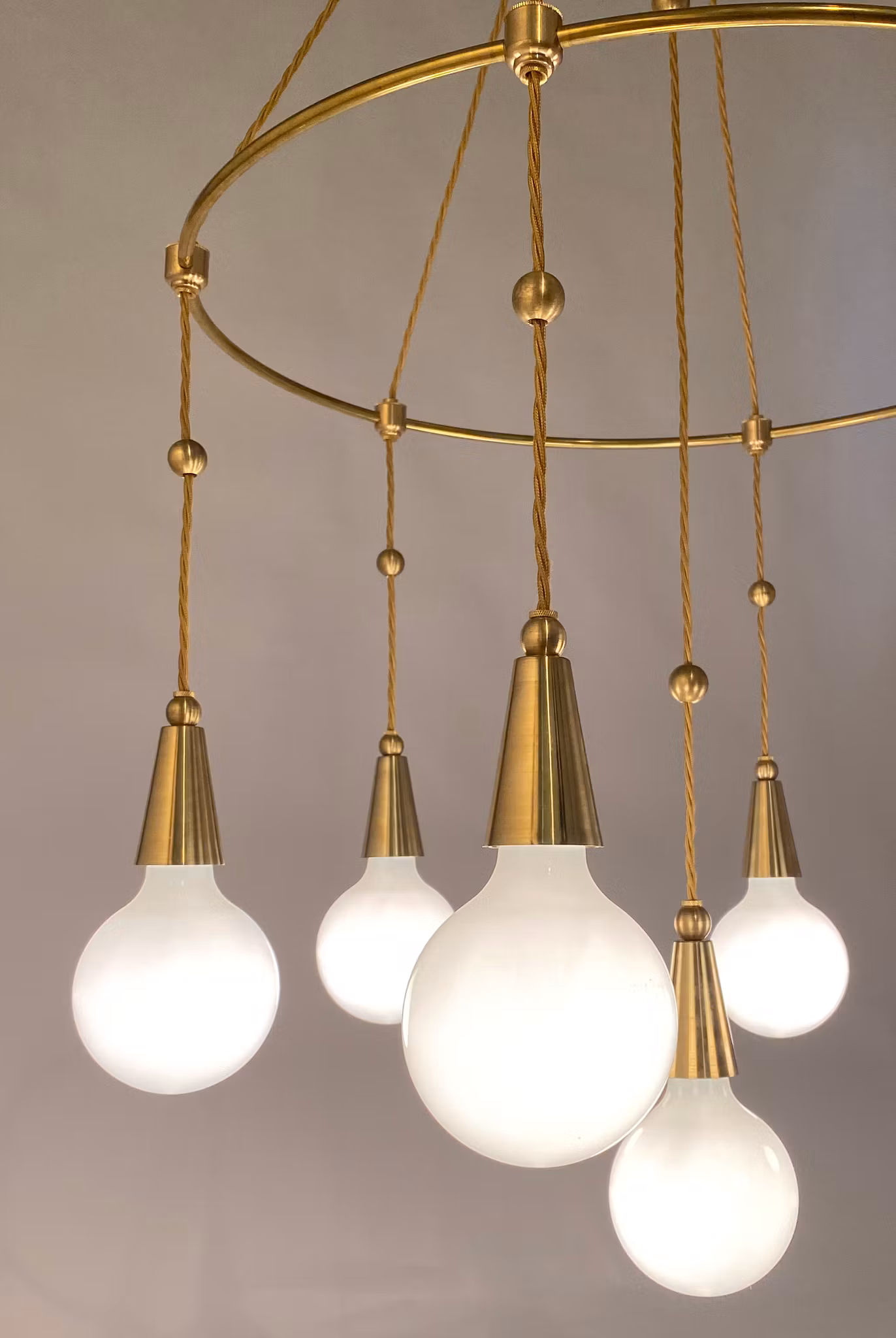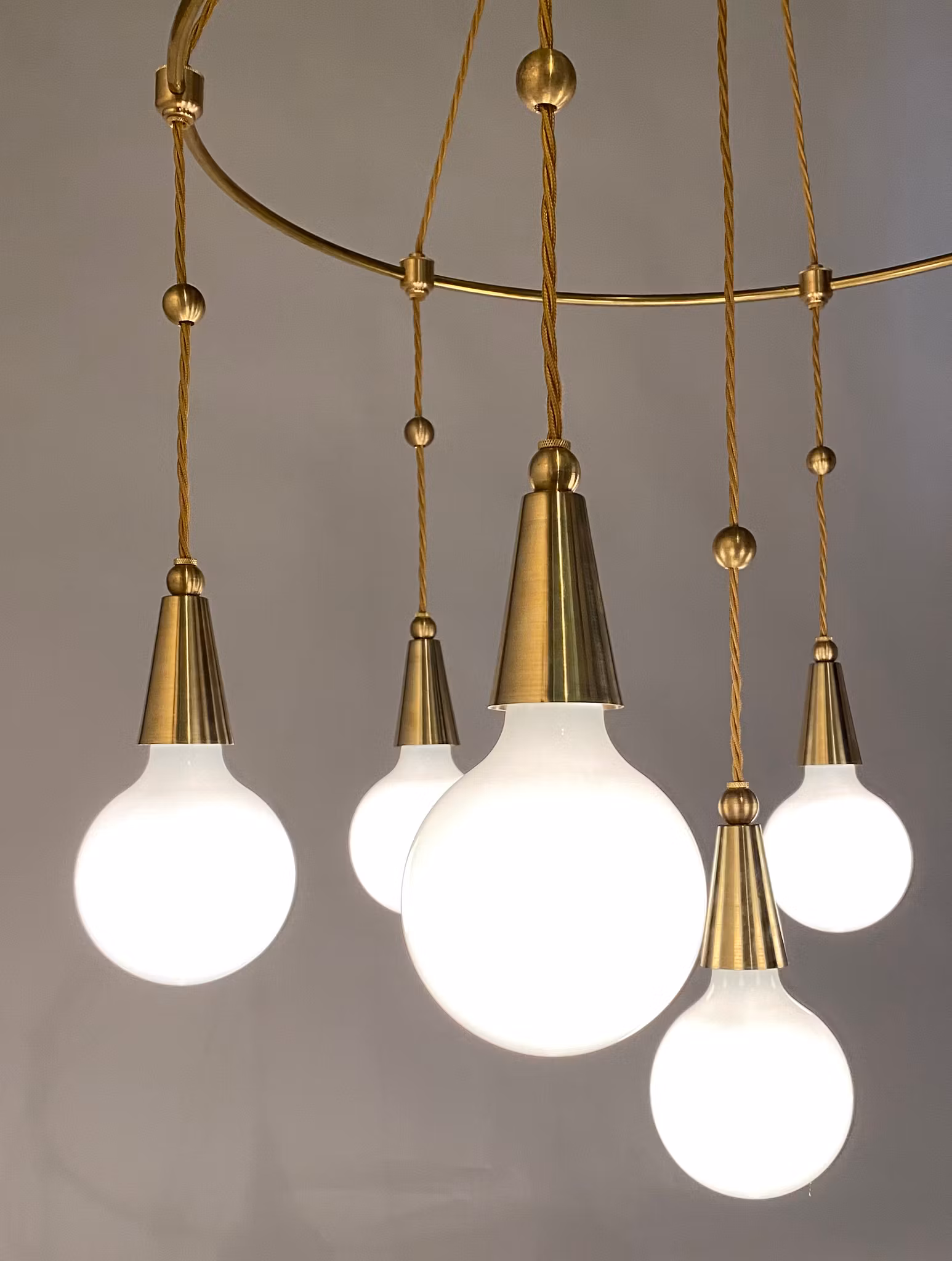 Takkrona i obehandlad mässing och textilkabel. Lampan på bilden är 70 cm i diameter och ca 135 cm hög inkl lampor men går att få i andra storlekar, t ex 100 cm och 120 cm i diameter med 8+1 lampor. Lampan på bilden har blanka opala ljuskällor med 3-stegsdimring, d v s genom att tända och släcka och tända igen kan du öka ljusstyrkan i tre steg och du behöver därför ingen dimmer. Lampan går även att få med opala matta eller klara dimbara ljuskällor där du reglerar ljusstyrkan från inkopplad dimmer. På bilden med biljardbordet hänger en CIRCUS som är 90 cm i diameter, 8+1 lampor.