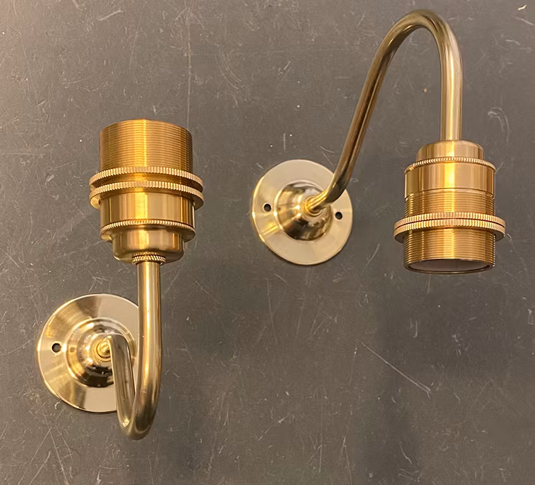 Liten vägglampett för direktinkoppling helt i obehandlad mässing. På bilderna är mässingen polerad. Lamphållare E27 med ringar där du kan fästa lampskärm med ringfäste.