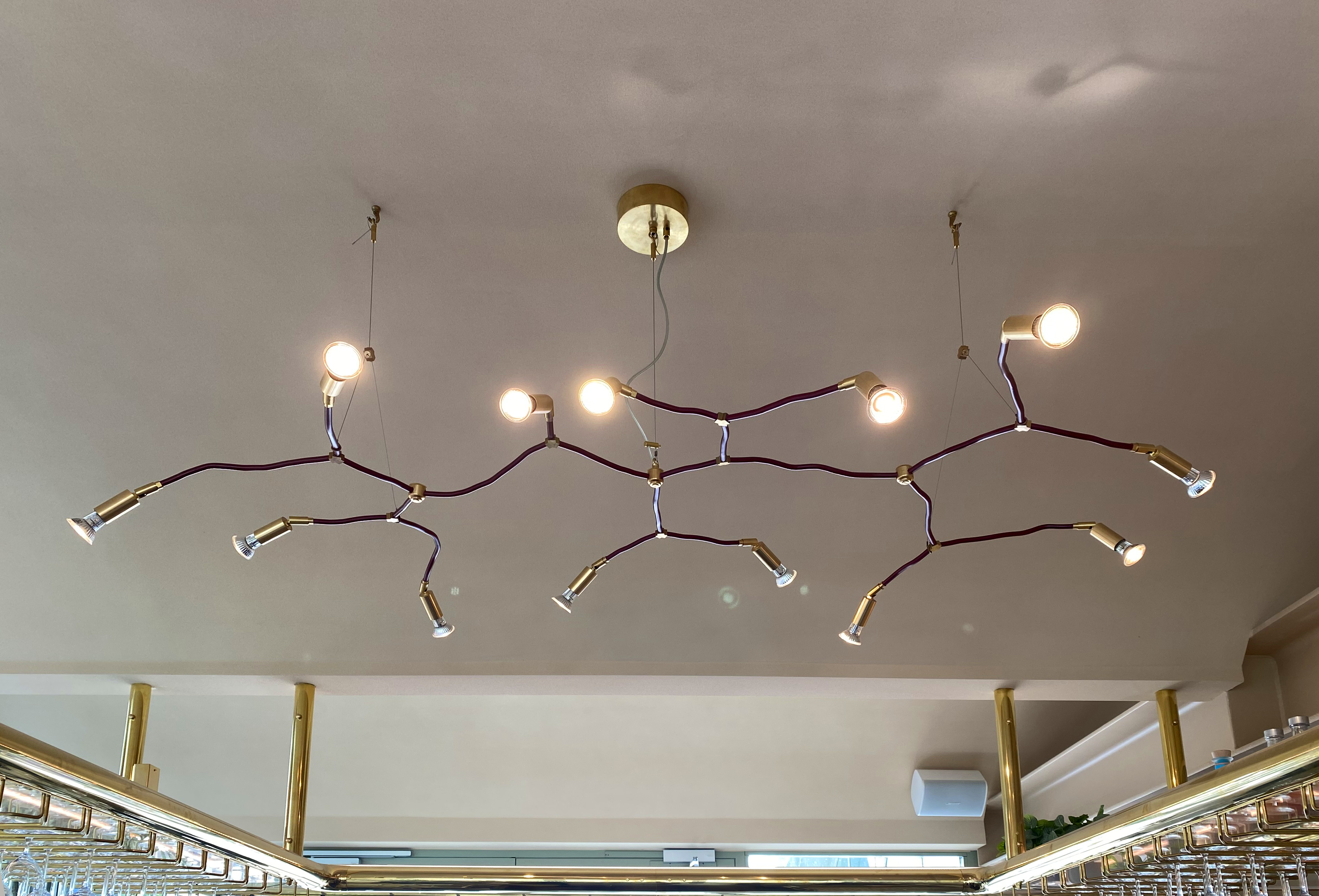 Branch med tretton spottar i vinrött och mässing över vinbaren på Villa Källhagen. Nedpendlad i vajrar från taket.