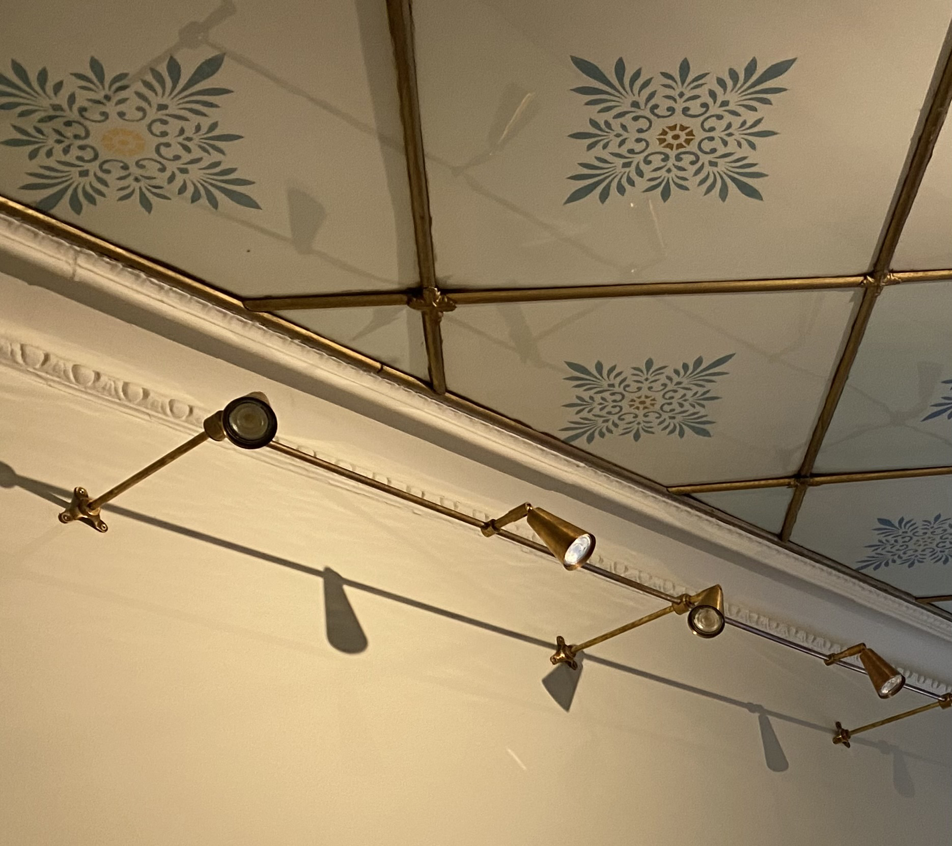 En butik i Gamla Stan i Stockholm behövde belysning som matchar taket. Det blev vintagebehandlade mässingsskenor med konformade lamphållare.